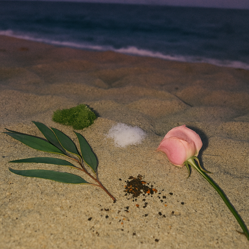 Lovers Beach captures the quiet romance of waves meeting the shore, where the air is fresh with ozone and the crispness of sun-dried linen. Bright green leaves add a touch of vitality, while sea salt and soft rose mingle with the cooling clarity of eucalyptus, evoking the feeling of skin warmed by the sun and kissed by an ocean breeze. Grounded in earthy moss, delicate powder, and a subtle trace of peppercorn, this fragrance is both airy and intimate - a serene, coastal escape that lingers with understated elegance.