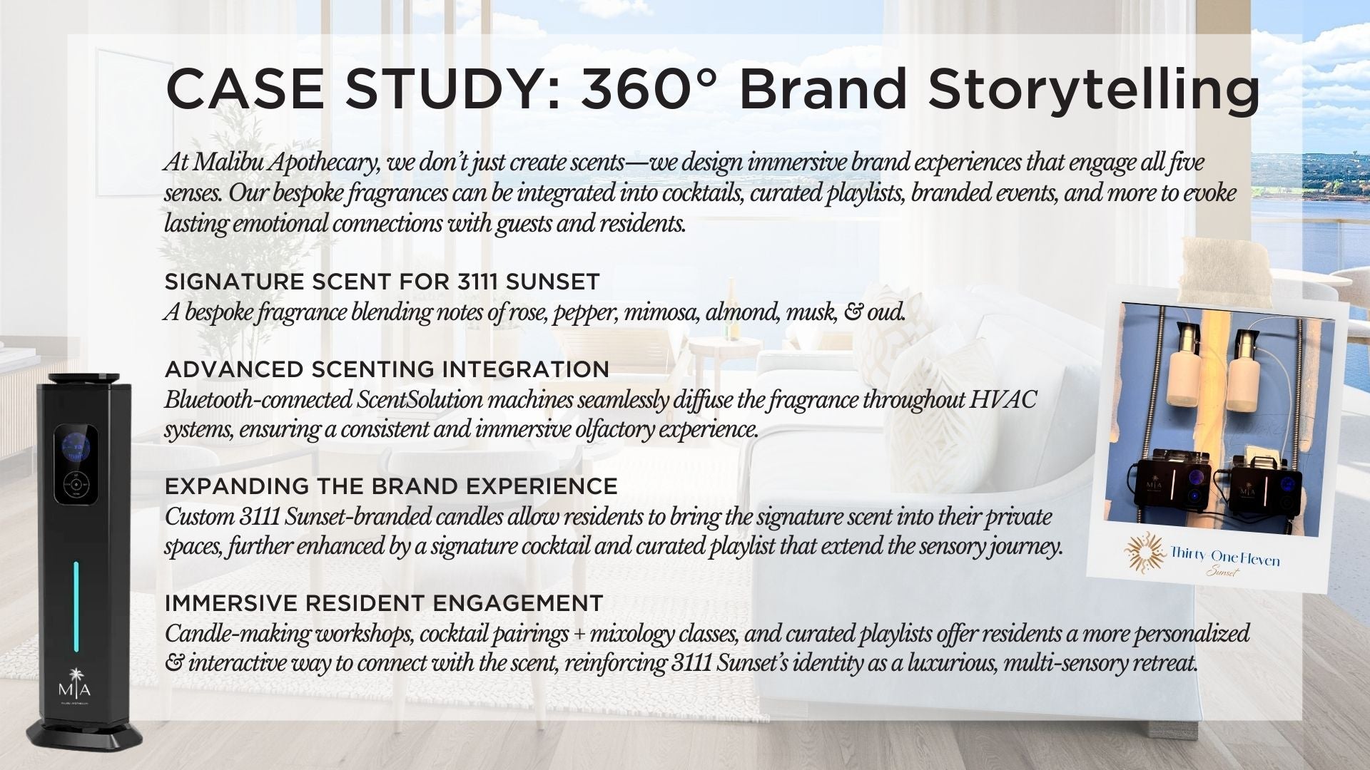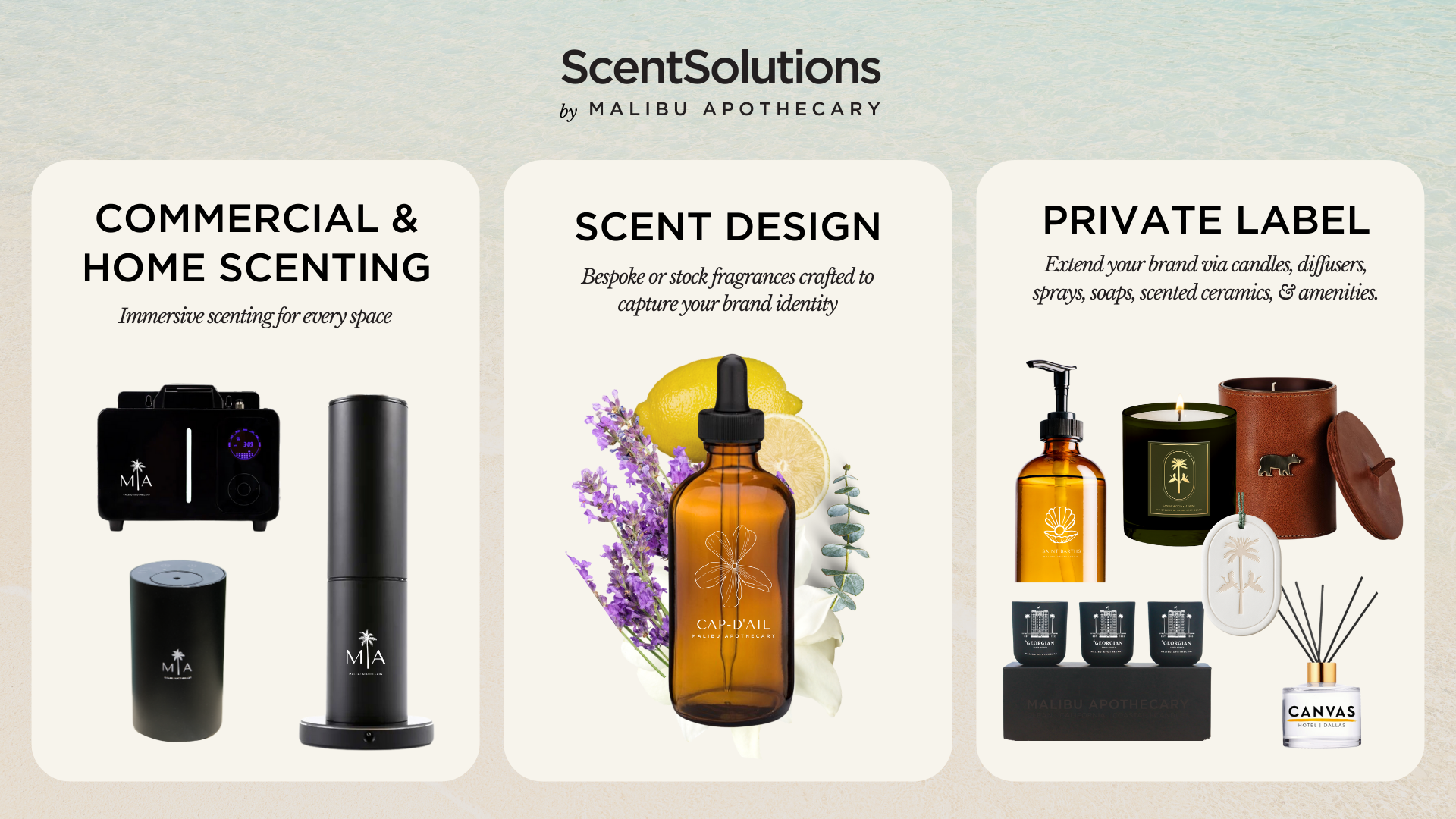 From luxury hotels and Fortune 500 companies to boutiques and weddings, Malibu Apothecary creates bespoke fragrance products and scent solutions that turn every encounter into a memory.